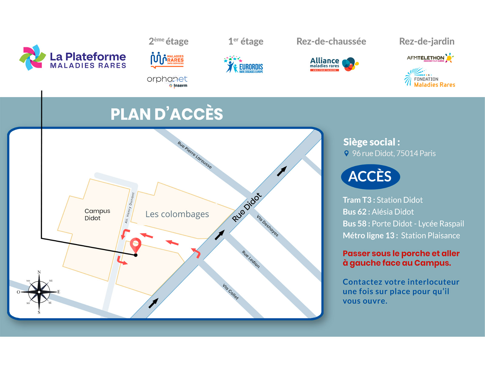 Comment se rendre La Plateforme maladies rares est située au 96 rue didot à Paris dans le 14ème. Elle ne reçoit pas le public, seulement les acteurs engagés dans le cadre d’événements et rencontres.